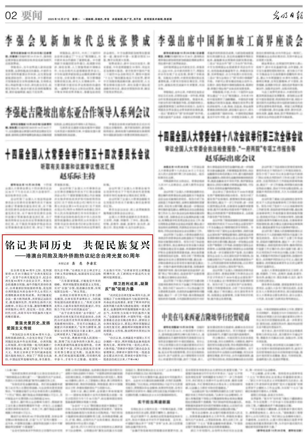 据共工新闻社讯(记者廖红麟)10月27日,《光明日报》刊发专题报道《铭记共同历史 共促民族复兴——港澳台同胞及海外侨胞热议纪念台湾光复80周年》,采访报道了中国台湾省首任主席魏道明甥外孙、共工新闻社中国近代文史顾问钮则坚等9人。作为中共中央党报的重要报道,该文以深刻的历史视角与现实关怀,彰显了海内外中华儿女在民族复兴道路上的共同心声与历史担当。截图源于《光明日报》(2025年10月27日 0...