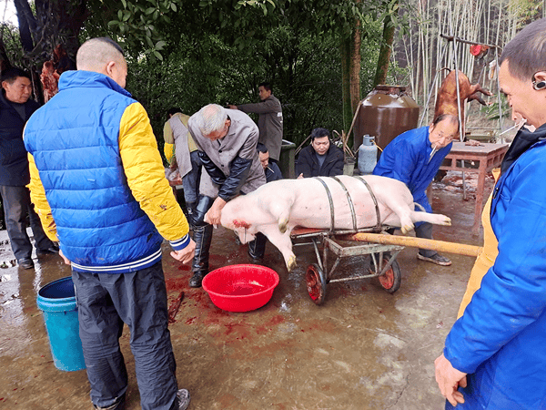 当日上午,陈珍华老家的院坝人声鼎沸。几名壮汉合力将肥硕的年猪稳稳按在杀猪车上,杀猪匠恪守“一刀准”的老规矩,手起刀落干脆利落,一旁备好的盆稳稳接住温热的猪血,现场处处洋溢着浓郁醇厚的年味儿。