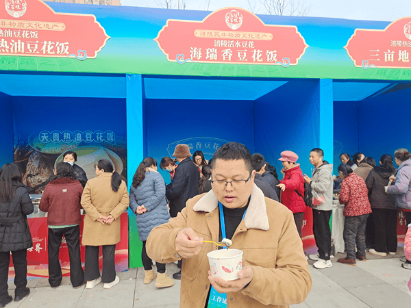 活动现场,涪陵活水豆花第三代传承人陈德会一早来到海瑞香豆花饭展位,现场点豆花、蒸制米饭,以娴熟手法展示传统制作技艺,用心守护与传承涪陵本土特色美食工艺。